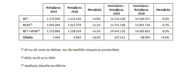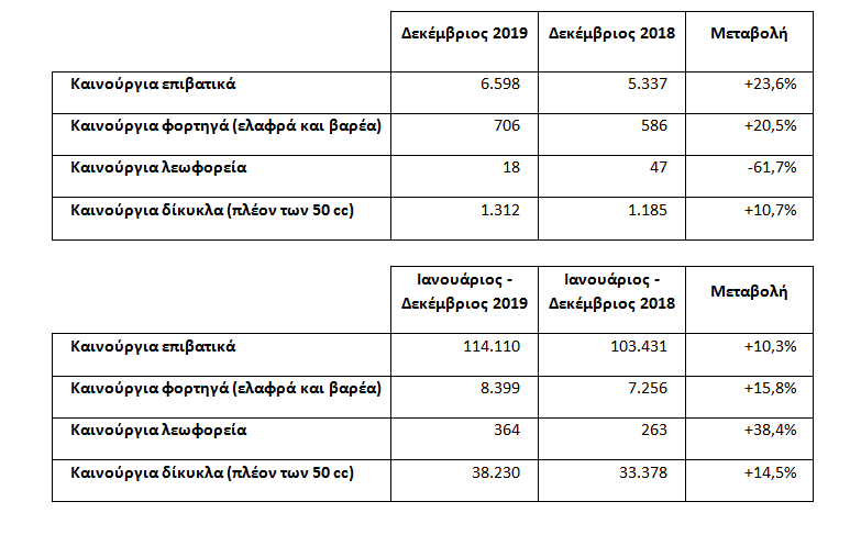 Άνοδο είχε η αγορά των αυτοκινήτων τον τελευταίο μήνα του χρόνου. Με βάση τα πρωτογενή στοιχεία της ΕΛΣΤΑΤ και την επεξεργασία του ΣΕΑΑ οι ταξινομήσεις καινούργιων οχημάτων τον περασμένο μήνα και για το σύνολο του έτους 2019, έχουν ως εξής: