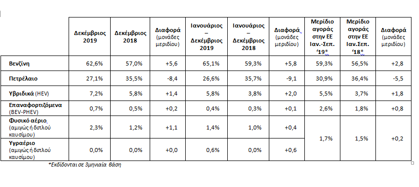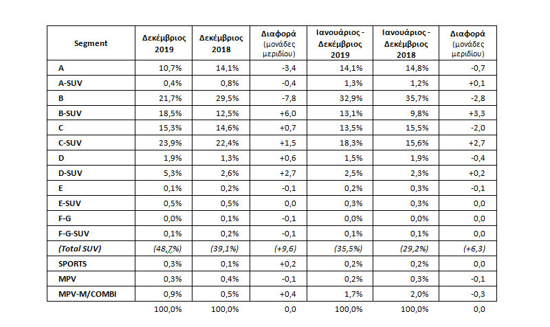 Σύμφωνα με τους πρώτους υπολογισμούς, η πρόοδος στα segments επιβατικών και στην κατανομή ανά καύσιμο, για το 2019, έχει ως εξής:
