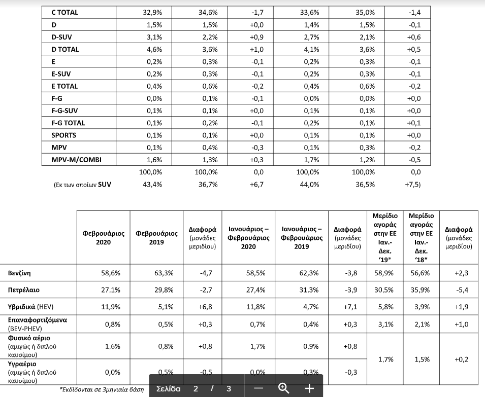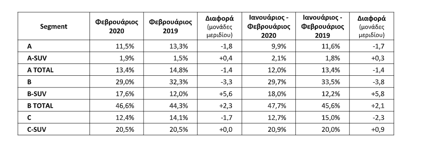 Σύμφωνα με πρώτους υπολογισμούς, η πρόοδος στα segments επιβατικών και στην κατανομή ανά καύσιμο, ως το Φεβρουάριο, έχει ως εξής: