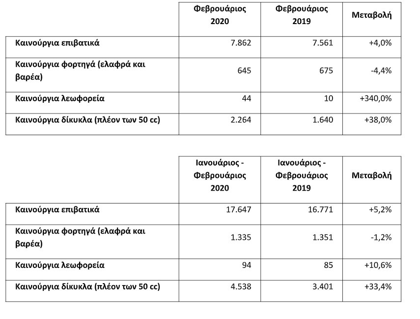 Το μήνα Φεβρουάριο οι ταξινομήσεις καινούργιων οχημάτων παρουσίασαν άνοδο 4 %. Με βάση τα πρωτογενή στοιχεία της ΕΛΣΤΑΤ και την επεξεργασία του ΣΕΑΑ οι ταξινομήσεις καινούργιων οχημάτων τον περασμένο μήνα και από την αρχή του έτους έχουν ως εξής: