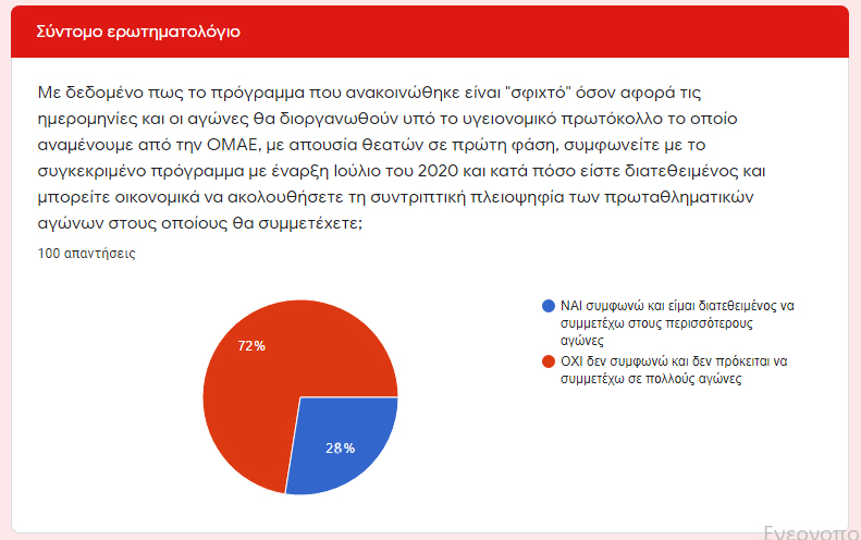 Το πρώτο από τα δύο ερωτήματα ήταν: «Με δεδομένο πως το πρόγραμμα που ανακοινώθηκε είναι «σφιχτό» όσον αφορά τις ημερομηνίες και οι αγώνες θα διοργανωθούν υπό το υγειονομικό πρωτόκολλο το οποίο αναμένουμε από την ΟΜΑΕ, με απουσία θεατών σε πρώτη φάση, συμφωνείτε με το συγκεκριμένο πρόγραμμα με έναρξη Ιούλιο του 2020 και κατά πόσο είστε διατεθειμένος και μπορείτε οικονομικά να ακολουθήσετε τη συντριπτική πλειοψηφία των πρωταθληματικών αγώνων στους οποίους θα συμμετέχετε;».Το 72% των ερωτηθέντων διαφώνησε με την έναρξη των αγώνων από τον Ιούλιο και απάντησε αρνητικά στη συμμετοχή στους περισσότερους αγώνες. Σε ποσοστό 28% οι συμμετέχοντες συμφώνησαν με το πρόγραμμα του 2020 και εξέφρασαν την επιθυμία να συμμετέχουν σε πολλούς αγώνες.
