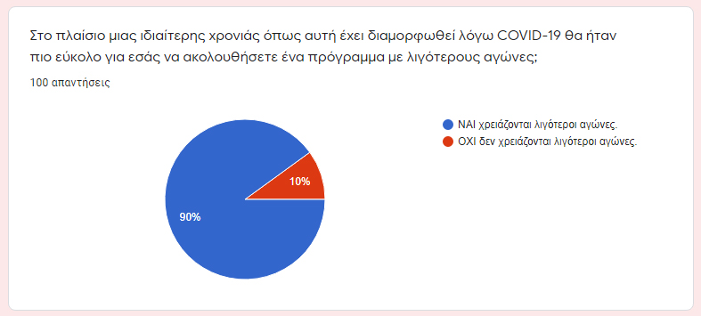 Το δεύτερο ερώτημα ήταν: «Στο πλαίσιο μιας ιδιαίτερης χρονιάς όπως αυτή έχει διαμορφωθεί λόγω COVID-19 θα ήταν πιο εύκολο για εσάς να ακολουθήσετε ένα πρόγραμμα με λιγότερους αγώνες;».