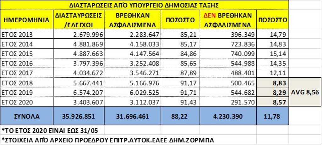 Όπως ανέφερε, σε ανάρτησή του στα μέσα κοινωνικής δικτύωσης: «Το θέμα των ανασφάλιστων οχημάτων είναι ένα κοινωνικό και οικονομικό θέμα που πρέπει να επιλυθεί οριστικά. Με αναγωγή του μέσου ποσοστού ανασφαλίστων 2018-2020, σύμφωνα με τους ελέγχους του Υπουργείου Δημοσίας Τάξεως επί του αριθμού των ασφαλισμένων, προκύπτει ότι αυτά είναι 586.206. Εάν δε προσθέσουμε τους ελέγχους του λιμεναρχείου, ξεπερνούν τις 600.000».
