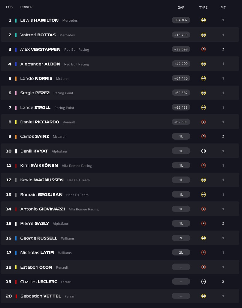 Στη δεύτερη θέση του πόντιουμ ανέβηκε ο ομόσταβλος του Βάλτερι Μπότας, καθώς πέρασε αρκετά νωρίς τον Κάρλος Σάινθ και λίγους γύρους πριν το τέλος πέρασε και τον Μαξ Φερστάπεν.