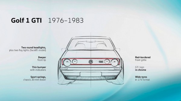 Το πρωτότυπο GTI παρουσιάστηκε το 1976, γεμάτο αυτοπεποίθηση με μαύρη μάσκα με κόκκινο περίγραμμα και – ακόμα – λιτή σχεδίαση. Οι προβολείς, που προεξέχουν από το καπό του ελαφρού compact αυτοκινήτου, ορίζουν τα άκρα του αμαξώματος. Το πρώτο λογότυπο GTI είναι από χρώμιο και δημιουργεί σκόπιμα μια έντονη αντίθεση με το μαύρο λογότυπο της Volkswagen. «Ακόμη και σε αυτό το πρώτο GTI, όλα τα στοιχεία του design αντικατοπτρίζουν μια ξεκάθαρη προσέγγιση», λέει ο σχεδιαστής του GTI, Marco Pavone.