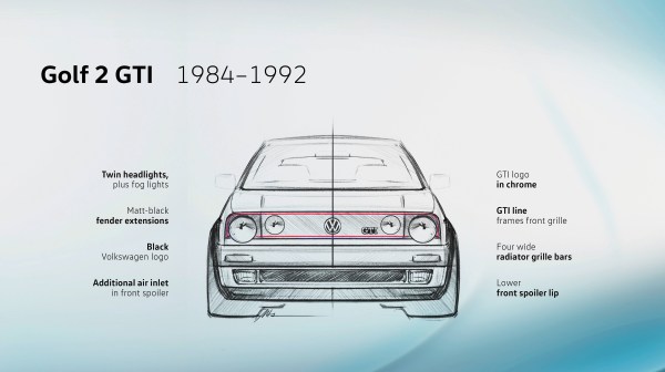 «Ο σχεδιασμός της δεύτερης γενιάς του Golf GTI αποτελεί μια συναρπαστική εξέλιξη», λέει ο Pavone. Όπως και ο προκάτοχος του διέθετε δίδυμους προβολείς, ενώ η έκδοση 16V της δεύτερης γενιάς του Golf GTI διέθετε από το 1988 ενσωματωμένα φώτα ομίχλης – τοποθετημένα δίπλα στους προβολείς. Η μάσκα έχει ακόμα περίγραμμα με κόκκινο χρώμα, ενώ και ο προφυλακτήρας διαθέτει επίσης μια κόκκινη GTI γραμμή. Κάτω από αυτόν υπάρχει για πρώτη φορά μια επιπλέον εισαγωγή αέρα.