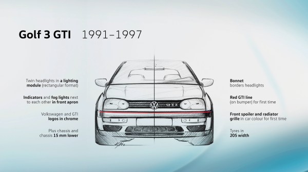 Η τρίτη γενιά του GTI είναι κάπως πιο «μαλακή» και έχει ένα ακόμα πιο έντονο σχήμα σφήνας. «Αυτό υποστηρίζει το σπορ χαρακτήρα του Golf GTI», εξηγεί ο Pavone. Το εμπρός μέρος διαθέτει μια εντυπωσιακή διαφοροποίηση: οι διπλοί προβολείς της δεύτερης γενιάς του GTI εξαφανίζονται κάτω από ένα συνδυασμένο ανακλαστήρα. Εξασφαλίζουν στη μάσκα, η οποία αποτελείται τώρα από τρεις φαρδιές οριζόντιες μπάρες, μια πιο συμπαγή εμφάνιση.