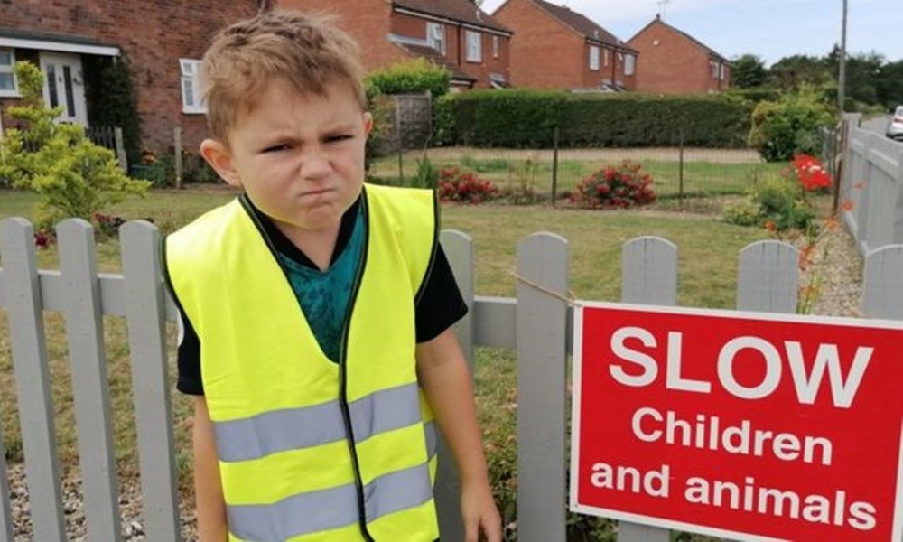 Οπλισμένος με ένα γιλέκο αρκετά ευδιάκριτο και μία πινακίδα με την ένδειξη «Αργά- παιδιά και ζώα», ο Χάρι στέκεται στο πλάι του δρόμου, έχοντας οπτική επαφή με τους περαστικούς οδηγούς.