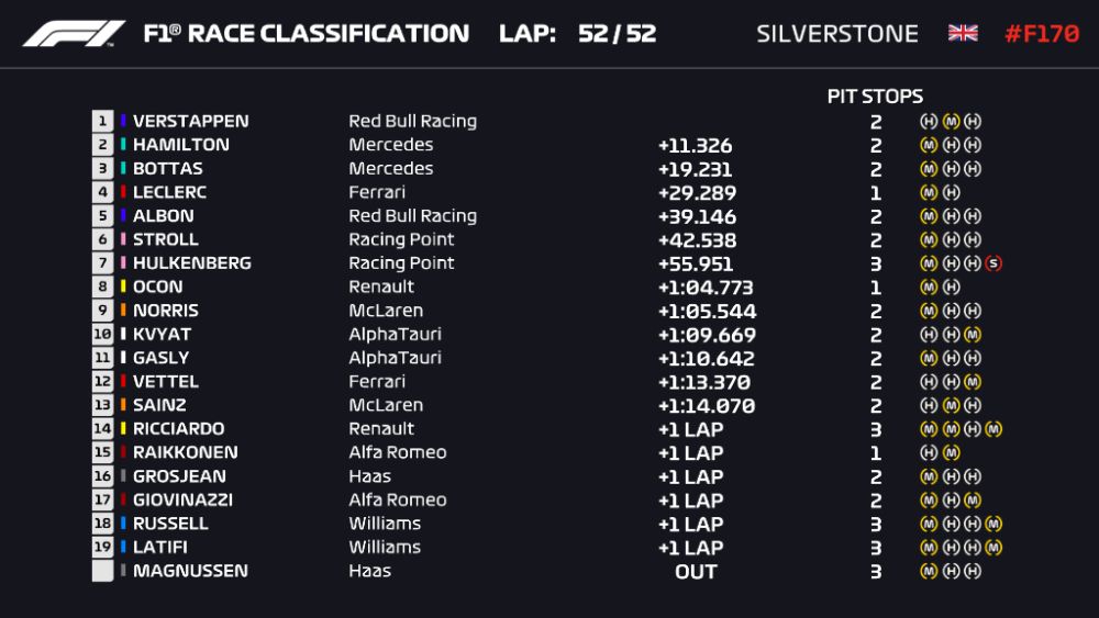 Πέμπτος ο Άλμπον που πραγματοποίησε έναν εξαιρετικό αγώνα και έδειξε ότι έχει θέση στην Red Bull, Ενώ τον ακολούθησαν οι Racing Point του Stroll και του Hulkenberg που έκανε στο τέλος και τρίτο pit stop.