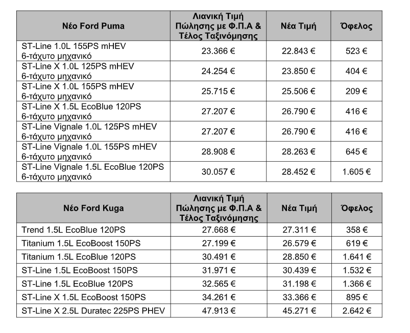 Με τις νέες προσφορές που κάνει η Ford στην Ελλάδα για τα νέα Puma και Kuga το όφελος φτάνει τα 1.605€ και 2.642€ αντίστοιχα. Χάρη στο νέο προωθητικό πρόγραμμα Hybrid Bonus της Ford Motor Ελλάς, τα οφέλη πολλαπλασιάζονται, καθώς η αγορά των κορυφαίων SUV μοντέλων συνοδεύεται από ένα νέο προνομιακό χρηματοδοτικό πρόγραμμα της Ford Finance.