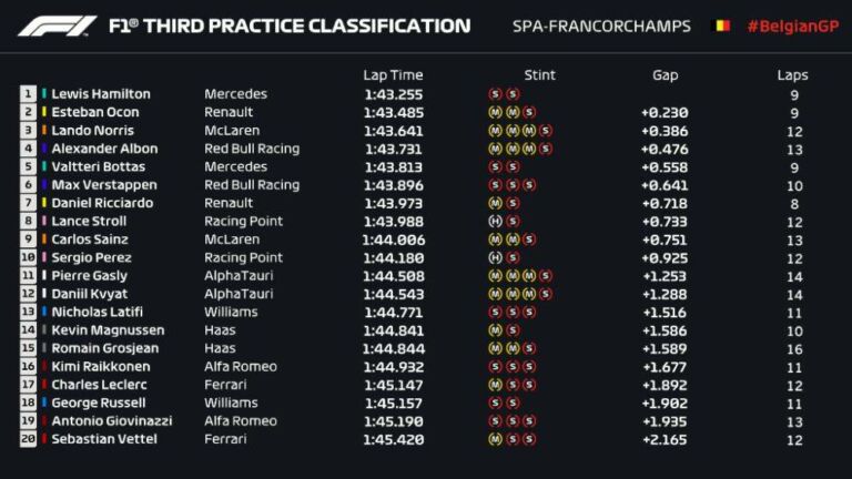 Χρόνος που εκτόπισε τον Esteban Ocon που έκανε προσωρινά την έκπληξη με τη Renault και τελικά ήταν δύο δέκατα πιο αργός, με τη McLaren του Lando Norris τρίτη και ένα δέκατο πιο αργή και τη Red Bull του Alex Albon στην τέταρτη και άλλο ένα δέκατο πιο πίσω.