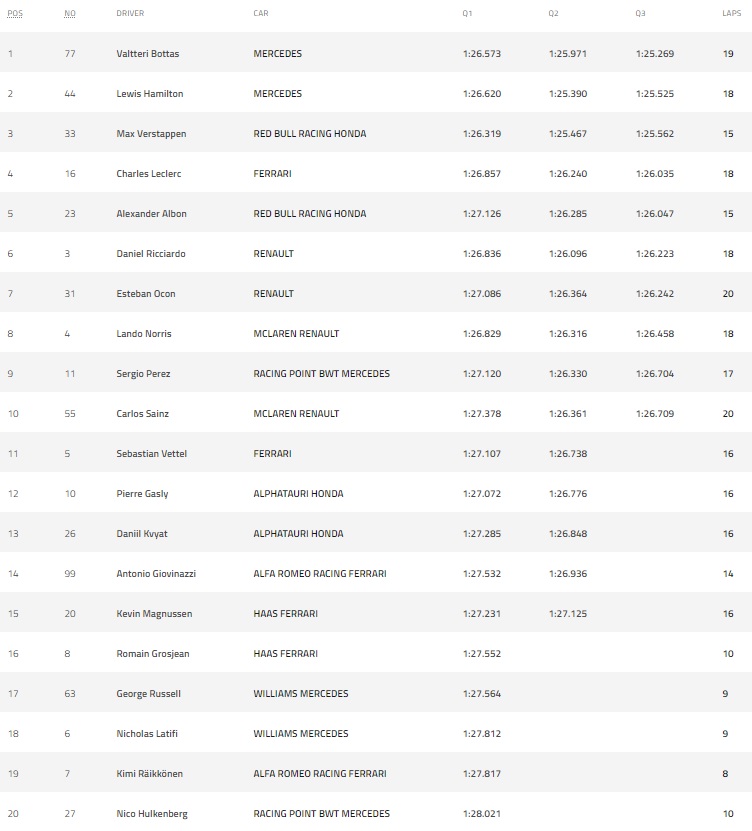 Φανταστική φόρμα είχε ο Βαλτέρι Μπότας, ο οποίος πήρε και την pole position. Ο Φινλανδός είχε ισχυρό ανταγωνισμό από τον teammate του, Λιούις Χάμιλτον, αλλά και από τον Μαξ Φερστάπεν της Red Bull ο οποίος ήταν πολύ ανταγωνιστικός. Ωστόσο δεν κατάφεραν να τον φρενάρουν και έτσι στον αγώνα της Κυριακής, θα ξεκινήσει από την πρώτη θέση! Πίσω του θα βρεθεί ο Λιούις Χάμιλτον, κάνοντας το 1-2 για την ομάδα της Mercedes.