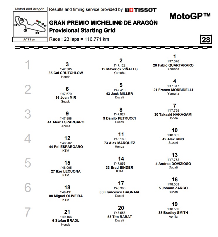 Ευτυχώς! Ο Γάλλος αναβάτης της Petronas Yamaha είχε εξαιρετικό ρυθμό. Κατάφερε να ακολουθήσει τον Μάβερικ Βινιάλες, ο οποίος είχε για αρκετή ώρα τον καλύτερο χρόνο και λίγο πριν το τέλος, ο Κουαρταραρό βελτίωσε, παίρνοντας εκείνος την pole! O αναβάτης της εργοστασιακής μοτοσικλέτας, Μάβερικ Βινιάλες έμεινε στη δεύτερη θέση τελικά και τρίτος, είναι ο Καλ Κράτσλοου. Ο Φράνκο Μορμπιντέλι προσπάθησε κι εκείνος να κάνει έναν πολύ καλό γύρο και να διεκδικήσει την pole ή έστω, μια θέση στην πρώτη σειρά εκκίνησης.