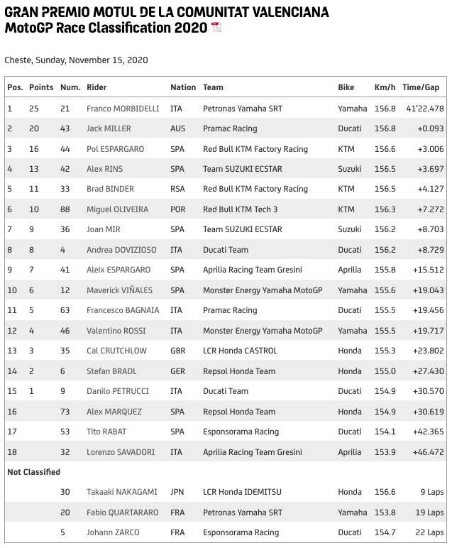O Zoαν Μιρ τερματίζοντας μόλις 7ος, κέρδισε το πρωτάθλημα MotoGP 2020, τερματίζοντας τα 20 χρόνια αναμονής για τη Suzuki. Ο Φράνκο Μορμπιντέλι όμως κέρδισε τον αγώνα παρά την πίεση που του άσκησε στους τελευταίους γύρους τους αγώνα ο Τζακ Μίλερ.