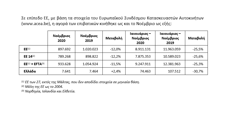 Η αγορά στα καινούργια Ι.Χ ανέβηκε το Δεκέμβριο του 2020 και μειώθηκε αισθητά η πτώση. Το Δεκέμβριο του 2019 πουλήθηκαν 6.597 ενώ το 2020 πουλήθηκαν 6.443 (πτώση 2.3%). Μικρότερη ήταν και η πτώση το Δεκέμβριο στα φορτηγά. Ταξινομήθηκαν 626 το 2020 ενώ το Δεκέμβριο του 2019 ταξινομήθηκαν 706 (πτώση 11.3%).