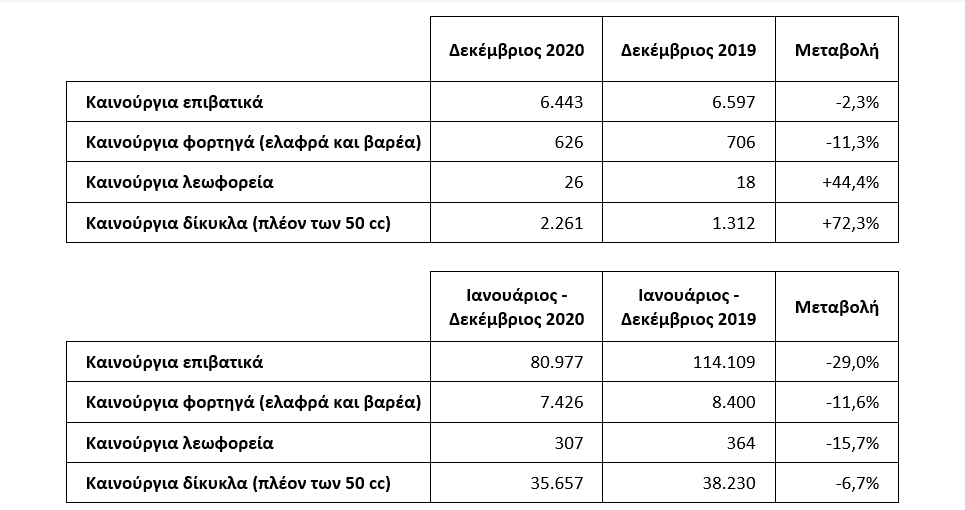 Το Δεκέμβριο του 2020 μειώθηκε αισθητά η πτώση στις πωλήσεις στα καινούργια Ι.Χ ενώ αυξήθηκαν οι πωλήσεις δικύκλων.