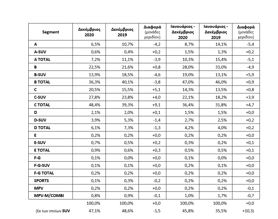 Η αγορά στα καινούργια Ι.Χ ανέβηκε το Δεκέμβριο του 2020 και μειώθηκε αισθητά η πτώση. Το Δεκέμβριο του 2019 πουλήθηκαν 6.597 ενώ το 2020 πουλήθηκαν 6.443 (πτώση 2.3%). Μικρότερη ήταν και η πτώση το Δεκέμβριο στα φορτηγά. Ταξινομήθηκαν 626 το 2020 ενώ το Δεκέμβριο του 2019 ταξινομήθηκαν 706 (πτώση 11.3%).