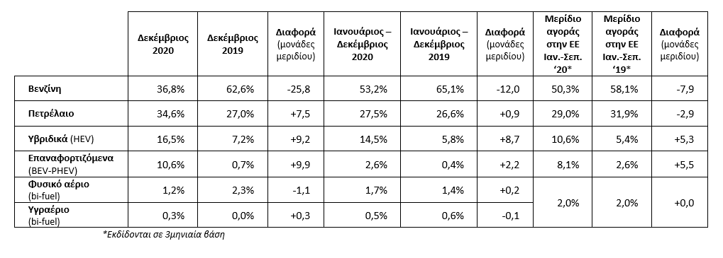 Το Δεκέμβριο του 2020 η πτώση (2.3 %) θα μπορούσε να ήταν ακόμη μεγαλύτερη. Την κατάσταση έσωσαν τα υβριδικά αυτοκίνητα (HEV) αλλά και τα επαναφορτιζόμενα ( BEV-PHEV). Και οι δύο κατηγορίες είχαν άνοδο στις πωλήσεις.