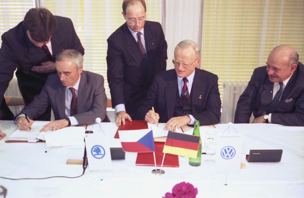 Στις 28 Μαρτίου 1991, ο Jan Vrba, Υπουργός Βιομηχανίας της Τσεχικής Δημοκρατίας και ο Carl H. Hahn, ως Πρόεδρος του Διοικητικού Συμβουλίου του Volkswagen Group, υπέγραψαν συμφωνία για την ίδρυση κοινής επιχείρησης παραγωγής οχημάτων SKODA. Το Volkswagen Group έλαβε το 31% των μετοχών της SKODA AUTO καταβάλλοντας 620 εκατομμύρια μάρκα. Στη συνέχεια, αύξησε σταδιακά το μερίδιό του έως το 100 % των μετοχών, στις 30 Μαΐου 2000.