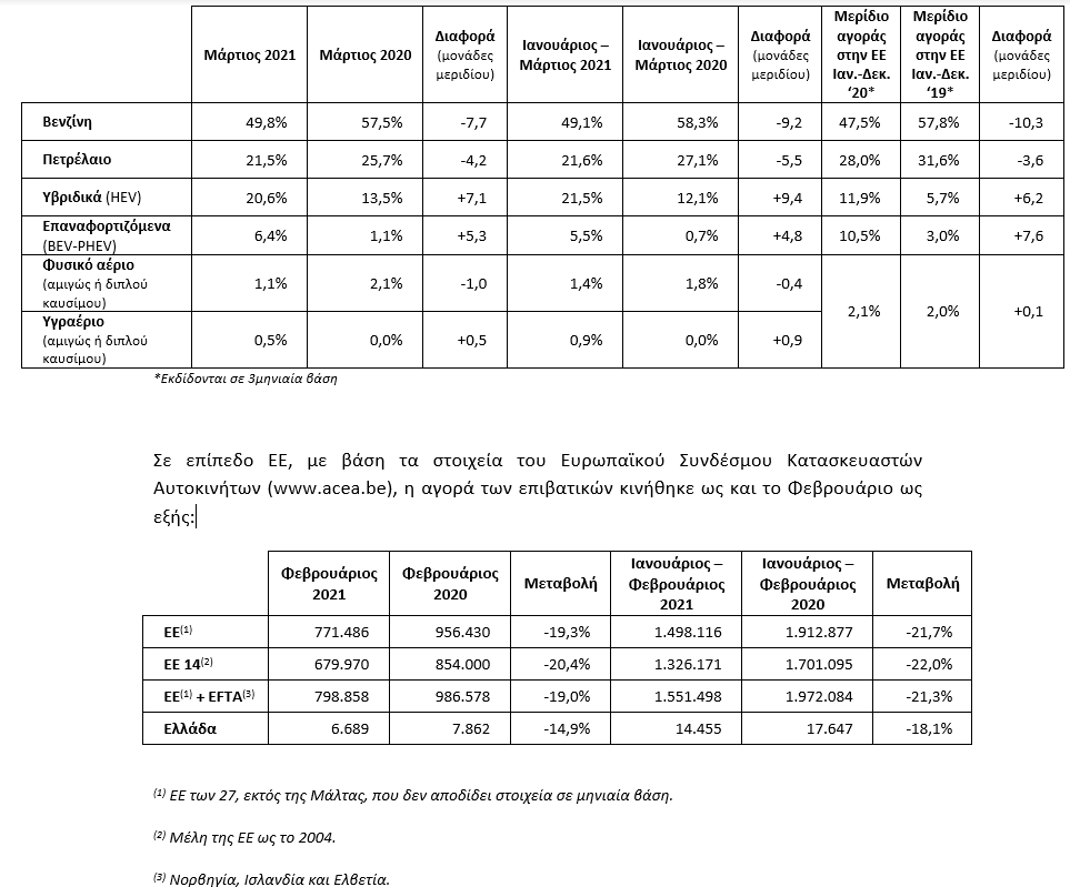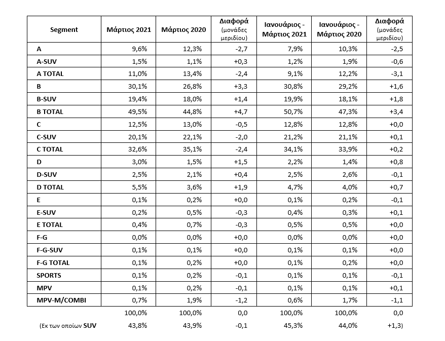 Σύμφωνα με πρώτους υπολογισμούς, η πρόοδος στα segments επιβατικών και στην κατανομή ανά καύσιμο, ως το Μάρτιο, έχει ως εξής: