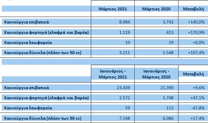 Σύμφωνα με τα πρωτογενή στοιχεία της ΕΛΣΤΑΤ και την επεξεργασία του ΣΕΑΑ οι ταξινομήσεις για το μήνα Μάρτιο ήταν 8.984 καινούργια επιβατικά αυτοκίνητα έναντι 3.743 τον αντίστοιχο μήνα του 2020.