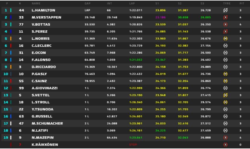 Έξι γύρους πριν το τέλος η πρώτη δεκάδα ήταν Hamilton, Verstappen, Bottas, Perez, Norris, Leclerc, Ocon, Alonso, Sainz και Ricciardo.
