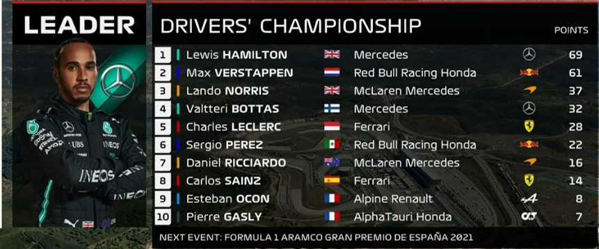 ενώ πίσω βρίσκεται ο Verstappen με 61. Στην 3 η θέση της βαθμολογίας βρίσκεται ο Norris με 32 βαθμούς.