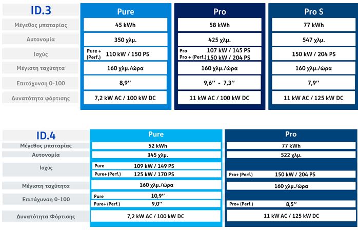 Πρόκειται για τις εκδόσεις Pure και Pure +, με την μπαταρία των 52 kWh και αυτονομία που φτάνει τα 345 χιλιόμετρα. Το ID.4 Pure, με ισχύ 149 PS (109 kW), καθίσταται πλέον το πιο προσιτό στη γκάμα, με προτεινόμενη λιανική τιμή 31.200 € (με την επιδότηση του προγράμματος «Κινούμαι Ηλεκτρικά», αρχική τιμή 37.200 €, επιδότηση 6.000 €). Την ίδια στιγμή, το ID.4 Pure +, που διαθέτει το πακέτο Performance για αναβάθμιση της ισχύος στους 170 PS (125 kW), έχει προτεινόμενη λιανική τιμή 34.283 € (με επιδότηση του προγράμματος «Κινούμαι Ηλεκτρικά», αρχική τιμή 39.000 €, επιδότηση 4.718 €).
