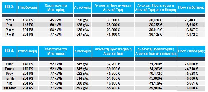 Πρόκειται για τις εκδόσεις Pure και Pure +, με την μπαταρία των 52 kWh και αυτονομία που φτάνει τα 345 χιλιόμετρα. Το ID.4 Pure, με ισχύ 149 PS (109 kW), καθίσταται πλέον το πιο προσιτό στη γκάμα, με προτεινόμενη λιανική τιμή 31.200 € (με την επιδότηση του προγράμματος «Κινούμαι Ηλεκτρικά», αρχική τιμή 37.200 €, επιδότηση 6.000 €). Την ίδια στιγμή, το ID.4 Pure +, που διαθέτει το πακέτο Performance για αναβάθμιση της ισχύος στους 170 PS (125 kW), έχει προτεινόμενη λιανική τιμή 34.283 € (με επιδότηση του προγράμματος «Κινούμαι Ηλεκτρικά», αρχική τιμή 39.000 €, επιδότηση 4.718 €).