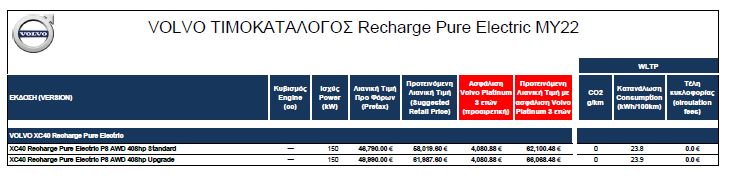 Το ολοκαίνουριο XC40 Recharge παίρνει άριστα. Δεν είναι φθηνό αυτοκίνητο. Οι τιμές τόσο στην έκδοση P8 AWD 408hp Standard όσο και στην πιο πλούσια P8 AWD 408hp Upgrade με την ειδική έκπτωση του Προγράμματος «Κινούμαι Ηλεκτρικά») κυμαίνονται από 56.101 έως 60.069 ευρώ.