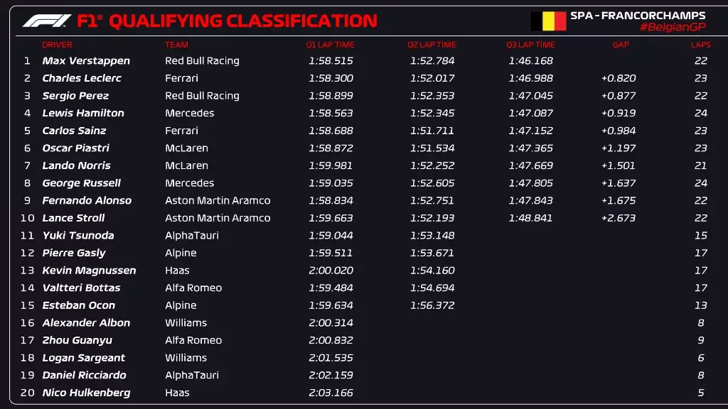 Ύστερα από επτά αγώνες, η Ferrari κατάφερε, έστω και με αυτόν τον τρόπο, να πανηγυρίσει την pole position, με τον Σαρλ Λεκλέρ να εκμεταλλεύεται την ποινή του Φερστάπεν και να ξεκινάει πρώτος στο Grand Prix του Βελγίου.