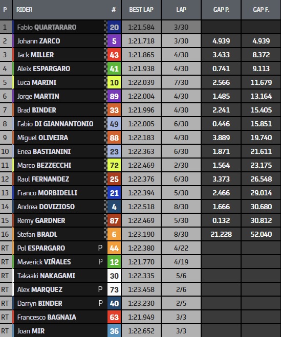 Ο μεγάλος νικητής εδραίωσε την παρουσία του στην κορυφή της βαθμολογίας, ειδικά από τη στιγμή που ο Αλέις Εσπαργκαρό με Aprilia έμεινε στην τέταρτη θέση (+9.113), καθώς πλέον τους χωρίζουν 34 βαθμοί.