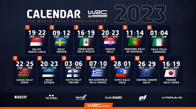 Από τον Ιανουάριο έως τον Νοέμβριο, το ημερολόγιο του 2023 περιλαμβάνει όλους τους αγώνες που ενθουσιάζουν ομάδες, οδηγούς αλλά και φιλάθλους, ενώ τα Ράλι του Μεξικού και της Χιλής επιστρέφουν για πρώτη φορά μετά την πανδημία Covid-19. «Ήμασταν αποφασισμένοι να επαναφέρουμε το ημερολόγιο του WRC στα πρότυπα που είχαμε πριν το ξέσπασμα της πανδημίας, έτσι έχοντας την δυνατότητα θα ταξιδέψουμε σε περισσότερες χώρες», δήλωσε ο Ανώτερος Διευθυντής Εκδηλώσεων του WRC, Simon Larkin.