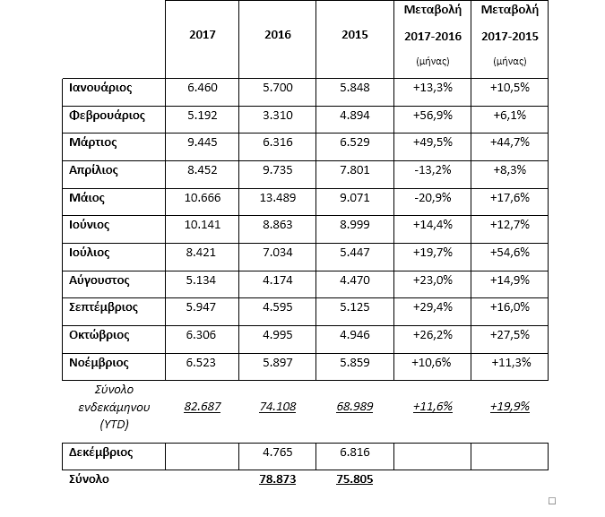 Συνολικά, στο ενδεκάμηνο Ιανουαρίου-Νοεμβρίου 2017 οι ταξινομήσεις καινούργιων επιβατικών είναι αυξημένες κατά +11,6% ως προς το αντίστοιχο διάστημα του 2016.