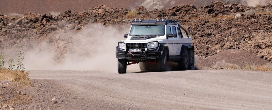 Ένα διπλοκάμπινο με έξι τροχούς και μήκος μόλις 6,23 m, τι καλύτερο για το ελληνικό καλοκαίρι; Η απόσταση από το έδαφος φτάνει τα 47 cm, ενώ η ανάρτηση της Brabus XLP εξελίχθηκε σε συνεργασία με την KW.