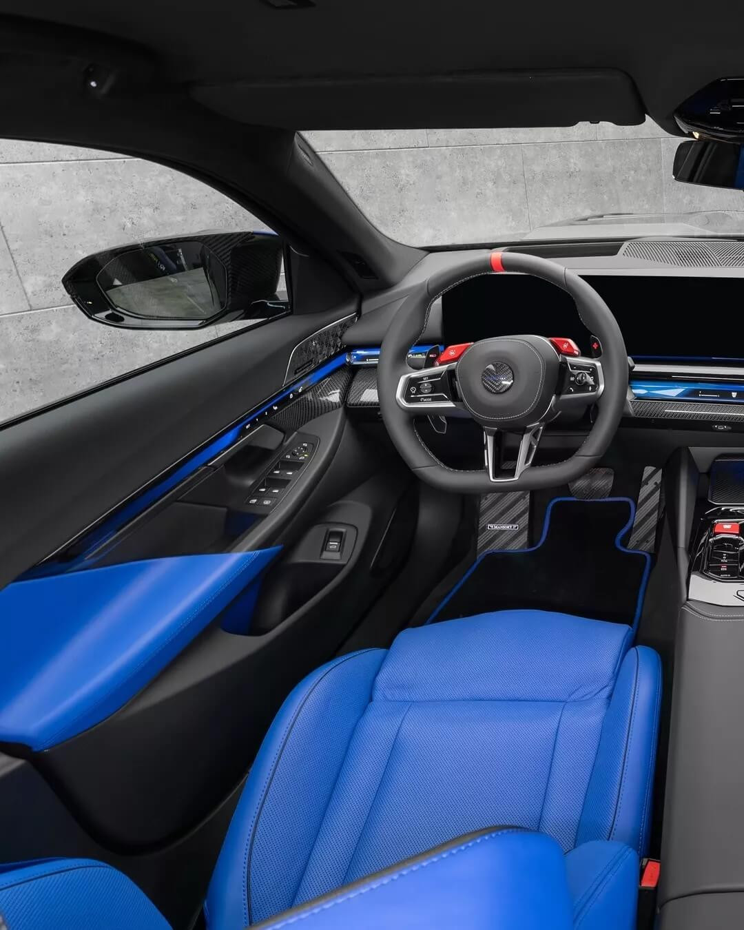 Το μπροστινό μέρος περιλαμβάνει νέο κάτω περίγραμμα στη μάσκα και επιπλέον σπόιλερ, αν και η πιο δραματική αλλαγή εντοπίζεται στο καπό. Οι πρόσθετοι αεραγωγοί στο κέντρο του αποτελούν ίσως την πιο έντονη παρέμβαση – τουλάχιστον εμπρός. Φυσικά, οι αλλαγές δεν σταματούν εκεί. Καλύμματα καθρεπτών από ανθρακονήματα, νέες πλαϊνές ποδιές και κάρμπον λεπτομέρειες γύρω από το σήμα της BMW. Ένα νέο σετ ζαντών 22 ιντσών ολοκληρώνει τις εξωτερικές αλλαγές, γεμίζοντας τις καμάρες και υπονοώντας την επιπλέον ισχύ κάτω από το καπό. Οι σχεδιαστές της Mansory φαίνεται πως εμπνεύστηκαν από το Honda Civic Type R, καθώς έχουν τοποθετήσει τρεις απολήξεις εξάτμισης στο κέντρο του πίσω προφυλακτήρα. Κανένα project της Mansory δεν θα ήταν ολοκληρωμένο χωρίς ριζικές αλλαγές στο εσωτερικό. Ο βελτιωτικός οίκος έχει προσθέσει ανοιχτό μπλε δέρμα στα καθίσματα και στα πάνελ των θυρών. Είναι κάθε άλλο παρά διακριτικό, αλλά για τα δεδομένα της Mansory το λες μάλλον συγκρατημένο. Στην εργοστασιακή του μορφή, ο υβριδικός V8 των 4,4 λίτρων με τα δύο τούρμπο αποδίδει 727 ίππους και 1.000 Nm. Η Mansory ανεβάζει την απόδοση στους 850 ίππους και στα 1.150 Nm. Κι αν κανείς δεν θα έλεγε ότι η νέα BMW M5 υστερεί σε γκάζι, η επιπλέον ισχύς είναι πάντα καλοδεχούμενη.