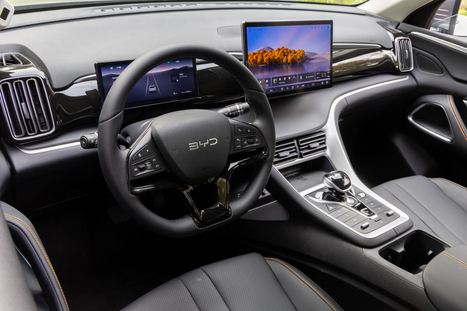 Στο πλάι, οι ισορροπημένες αναλογίες και το μακρύ μεταξόνιο ενισχύουν την αντίληψη για ένα ευρύχωρο SUV. Και στο πίσω μέρος, η φωτεινή μπάρα LED που ενώνει τα φώτα τονίζει το πλάτος του αμαξώματος. Συνολικά, η εικόνα του Sealion 5 DM-i κινείται ανάμεσα στο σύγχρονο και στο διακριτικά ώριμο, στοιχεία που εκτιμά το κοινό της κατηγορίας. Μπαίνοντας στην καμπίνα του Sealion 5 DM-i, η πρώτη εικόνα είναι αυτή ενός ευρύχωρου και σύγχρονου περιβάλλοντος που έχει σχεδιαστεί με γνώμονα την καθημερινή άνεση. Η τοποθέτηση της μπαταρίας τύπου Blade στο πάτωμα επιτρέπει τη δημιουργία ενός εντελώς επίπεδου δαπέδου πίσω. Που μεταφράζεται σε πραγματική ευκολία για τρεις ενήλικους επιβάτες, χωρίς τους συνηθισμένους περιορισμούς στον χώρο για τα πόδια. Το μακρύ μεταξόνιο και το τετραγωνισμένο σχήμα του κλωβού της καμπίνα, ενισχύουν περαιτέρω την ευρυχωρία, κάνοντας το Sealion 5 DM-i να ανταποκρίνεται με άνεση στον οικογενειακό του ρόλο. Η ποιότητα κατασκευής κινείται σε καλό επίπεδο, με μαλακά πλαστικά στα σημεία που έρχονται σε επαφή με τους επιβάτες και προσεγμένη συναρμογή που δείχνει ότι θα αντέξει στον χρόνο. Τα εμπρός καθίσματα διαθέτουν ηλεκτρικές ρυθμίσεις, προσφέροντας ευκολία στην εύρεση της ιδανικής θέσης οδήγησης. Ωστόσο, η πλευρική στήριξη θα μπορούσε να είναι καλύτερη για πιο απαιτητικούς οδηγούς. Σε κάθε περίπτωση, το τιμόνι ρυθμίζεται επαρκώς και η θέση οδήγησης προσαρμόζεται εύκολα, με την περιμετρική ορατότητα να κρίνεται καλή, διευκολύνοντας τις καθημερινές μετακινήσεις. Στο επίκεντρο της εμπειρίας βρίσκεται το ψηφιακό περιβάλλον. Ο πίνακας οργάνων των 8,8 ιντσών προβάλλει με ευκρίνεια τις βασικές πληροφορίες. Η κεντρική οθόνη αφής των 12,8 ιντσών αναλαμβάνει τον ρόλο του κέντρου ελέγχου για το σύστημα infotainment. Σε αντίθεση με προηγούμενα μοντέλα της BYD, εδώ η οθόνη παραμένει σταθερή στην οριζόντια διάταξη. Επιλογή που προέκυψε από την ανάγκη για μεγαλύτερη εργονομία και λιγότερο εντυπωσιασμό. Το σύστημα υποστηρίζει Apple CarPlay και Android Auto, δέχεται φωνητικές εντολές μέσω της λειτουργίας «Hi BYD» και αναβαθμίζεται over-the-air, καλύπτοντας πλήρως τις σύγχρονες απαιτήσεις συνδεσιμότητας. Παρότι η λειτουργία του συστήματος είναι συνολικά ικανοποιητική, η υπερβολική εξάρτηση από την οθόνη για βασικές λειτουργίες δημιουργεί ορισμένες εργονομικές αδυναμίες. Για παράδειγμα, η απενεργοποίηση ορισμένων συστημάτων υποβοήθησης απαιτεί αναζήτηση σε υπό-μενού, ενώ ακόμη και η ρύθμιση της θέρμανσης των καθισμάτων δεν γίνεται μέσω φυσικών διακοπτών, κάτι που μπορεί να αποσπάσει την προσοχή του οδηγού εν κινήσει. Υπάρχουν πάντως μερικά φυσικά μπουτόν κοντά στον επιλογέα για βασικές λειτουργίες, όπως ο κλιματισμός και τα οδηγικά προφίλ, που βελτιώνουν την καθημερινή χρήση. Σε επίπεδο πρακτικότητας, η BYD έχει φροντίσει να ενσωματώσει αρκετούς αποθηκευτικούς χώρους, αν και όχι πάντα με την καλύτερη εργονομία. Οι εμπρός θύρες USB-C, με ισχύ έως 60W, βρίσκονται σε σχετικά δυσπρόσιτο σημείο, ενώ η ασύρματη φόρτιση διατίθεται μόνο στην πλουσιότερη έκδοση.