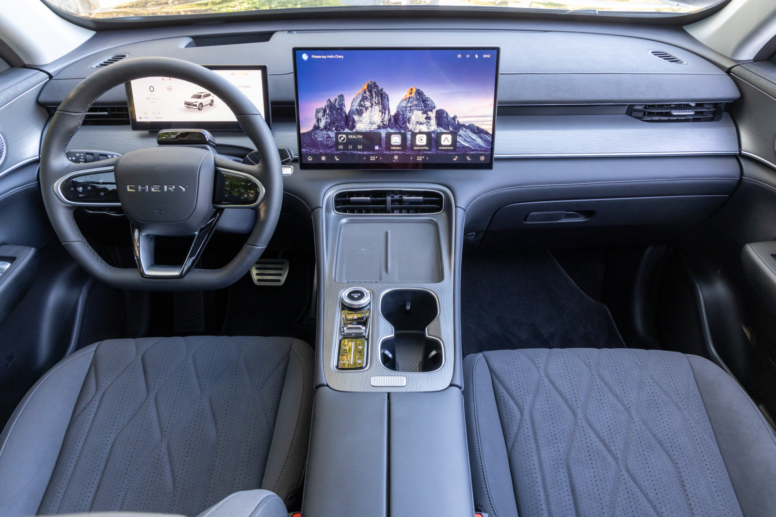 Μπαίνοντας στο εσωτερικό του Tiggo 8, είναι εύκολο να εντυπωσιαστείς από τον όγκο της τεχνολογίας που προσφέρει. Το κεντρικό στοιχείο είναι οι δύο οθόνες, ξεχωριστές, με επίπεδη επιφάνεια. Η οθόνη του infotainment με διαγώνιο 15,6” προσφέρει ασύρματο Apple CarPlay και Android Auto (καθώς και ενσωματωμένο σύστημα πλοήγησης).