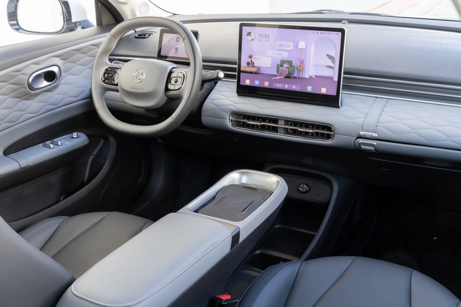 Όπως στα περισσότερα αυτοκίνητα πλέον, το περιβάλλον στο εσωτερικό είναι πλήρως ψηφιακό, με μικρό πίνακα οργάνων και μια μεγάλη επικαθήμενη οθόνη αφής 12″ στο κέντρο του ταμπλό. Το μενού του infotainment ακολουθεί τη λογική Android, με καλή ευκρίνεια, ωραία γραφικά και σχετικά γρήγορη απόκριση στις εντολές.