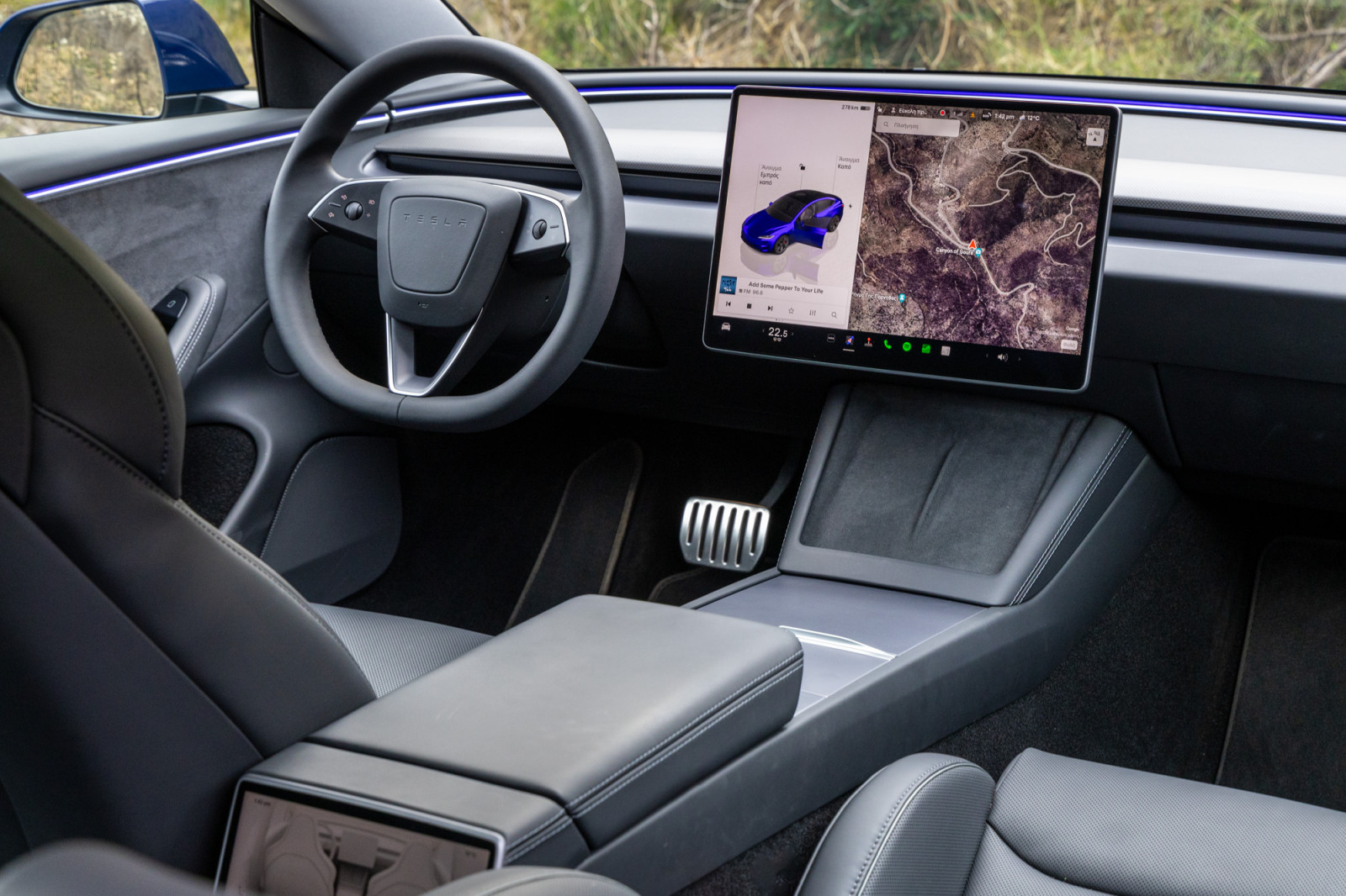 Ο εμπρός προφυλακτήρας είναι εντελώς διαφορετικός από αυτόν της στάνταρ έκδοσης, με μεγάλο σπλίτερ και κάθετες εισαγωγές αέρα που το κάνουν να δείχνει πιο χαμηλό και φαρδύ. Το αμάξωμα είναι πιο κοντά στο έδαφος, ενώ οι σφυρήλατες 20άρες ζάντες με λάστιχα υψηλών προδιαγραφών της Pirelli, 235/35 R20 εμπρός και 255/35 R20 πίσω, συμπληρώνουν την εικόνα. Στα ενδότερα των τροχών κρύβονται μεγαλύτεροι αεριζόμενοι δίσκοι και οι κόκκινες δαγκάνες της Tesla που φιλοξενούν νέα τακάκια με πιο ανθεκτικά υλικά τριβής. Πιο δυναμικό είναι και το πίσω μέρος όπου ξεχωρίζει η διακριτική αεροτομή από ανθρακονήματα και ο ανασχεδιασμένος προφυλακτήρας με τον πιο ανάγλυφο διαχύτη. Σχεδιαστικές επεμβάσεις που δεν έγιναν μόνο προς τέρψιν των οφθαλμών μας, αλλά κρύβουν ουσιαστικές βελτιώσεις στην αεροδυναμική απόδοση. Η αντίσταση στον αέρα μειώθηκε κατά 5%, ενώ παράλληλα η αρνητική άντωση στις υψηλές ταχύτητες αυξήθηκε κατά 36%. Στοιχεία που φανερώνουν ότι αυτή τη φορά, η Tesla επένδυσε σοβαρά στη δημιουργία μια πραγματικά σπορ ηλεκτρικής μπερλίνας. Στην καμπίνα, οι αλλαγές είναι μικρότερης έκτασης αλλά ουσιαστικές όσον αφορά την ποιότητα. Δεν περιορίζονται μόνο στα νέα καθίσματα που προσφέρουν πολύ καλή πλευρική στήριξη. Είναι επιπλέον πιο όμορφα στο μάτι και έρχονται στάνταρ με σύστημα αερισμού για θέρμανση και ψύξη. Τον συνολικό διάκοσμο στο αναβαθμισμένο ποιοτικά εσωτερικό, που έχει ακόμα πιο προσεγμένη συναρμογή από το παρελθόν, αναβαθμίζουν οι πινελιές από ανθρακόνημα που εμφανίζονται για πρώτη φορά σε έκδοση του Model 3. Αφήνοντας την αναβαθμισμένη συναρμογή και τα ποιοτικότερα υλικά στην άκρη, το εσωτερικό του Model 3 Performance παραμένει πιστό στην εξαιρετικά μίνιμαλ φιλοσοφία της Tesla. Με την οθόνη αφής των 15,4” να ενσωματώνει σχεδόν όλες τις λειτουργίες του αυτοκινήτου -μόνο τα πεντάλ, το τιμόνι και τα φλας δεν ελέγχονται μέσα από αυτήν! Με τα τελευταία να ενεργοποιούνται από δύο διακόπτες στο αριστερό μπράτσο του τιμονιού. Και ναι, θέλει χρόνο μέχρι να αναπρογραμματίσεις τον εγκέφαλό σου και να μην ψάχνει το χέρι σου τον παραδοσιακό μοχλό πίσω από το τιμόνι. Ένα αντίστοιχο κουμπί στο δεξί μπράτσο ενεργοποιεί τους υαλοκαθαριστήρες σε περίπτωση που έχεις ξεχάσει να επιλέξεις την αυτόματη λειτουργία. Όπως καταλαβαίνετε, τα εργονομικά ζητήματα δεν εξαφανίστηκαν με την ανανέωση του Model 3 και η πλήρης εξάρτηση από την οθόνη αφής εξακολουθεί να απαιτεί χρόνο προσαρμογής. Τουλάχιστον η τελευταία διαθέτει ένα κατανοητό και εύχρηστο ιντερφέις, με γραφικά και απόκριση εφάμιλλα των κορυφαίων τάμπλετ της αγοράς. Μέσω αυτής ελέγχονται όλα τα συστήματα του αυτοκινήτου, ενώ στο επάνω μέρος προβάλλονται βασικές πληροφορίες για τη λειτουργία και τη χρήση του, λειτουργώντας ως πίνακας οργάνων. Η περιήγηση στα διάφορα μενού γίνεται μέσω μιας γραμμής εργασιών στο κάτω μέρος της οθόνης. Οι πίσω επιβάτες διαθέτουν μια δεύτερη οθόνη 8”, μέσω της οποίας μπορούν να ρυθμίσουν τον κλιματισμό και άλλες λειτουργίες του infotainment. Διαβάστε τη συνέχεια της δοκιμής του νέου Tesla Model 3 Performance στο drive.gr