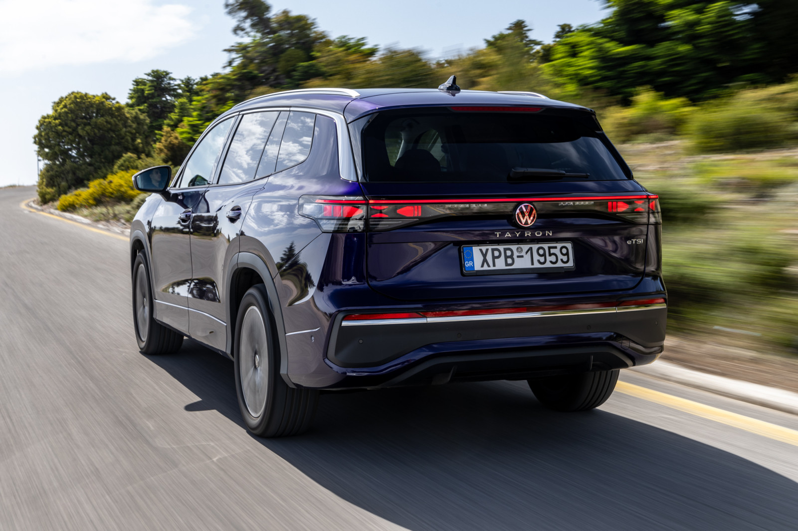Στο εμπρός μέρος, η μεγάλη κάθετη μάσκα προσδίδει έξτρα πόντους δυναμισμού την ώρα που τα μακρόστενα φώτα LED εμπρός και πίσω ενώνονται με μια οριζόντια, φωτιζόμενη μπάρα που καταλήγει στους επίσης φωτιζόμενους λογότυπους VW. Ένα ευπρόσδεκτο, σύγχρονο gimmick που χαρίζει στο VW Tayron εντυπωσιακή φωτεινή ταυτότητα, ιδίως τη νύχτα.