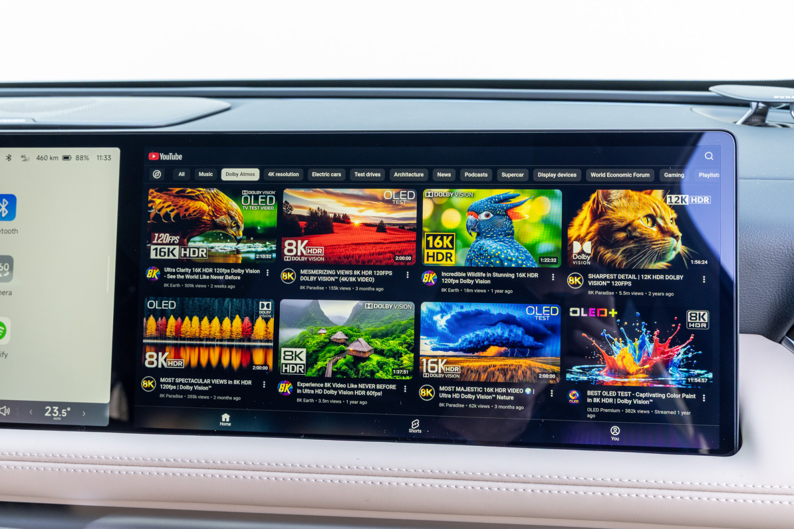 Μπαίνοντας στο εσωτερικό, η πολυτελής στόχευση γίνεται αμέσως αντιληπτή. Ο οδηγός έχει εμπρός του μια οθόνη ~15”, ενώ ο συνοδηγός διαθέτει αντίστοιχης διαμέτρου οθόνη για ψυχαγωγία. Η κεντρική κονσόλα φιλοξενεί οθόνη των 10,25” για τον έλεγχο όλων των λειτουργιών, η οποία προσφέρει εύκολη πλοήγηση στα μενού και άμεση πρόσβαση στις βασικές ρυθμίσεις του αυτοκινήτου.