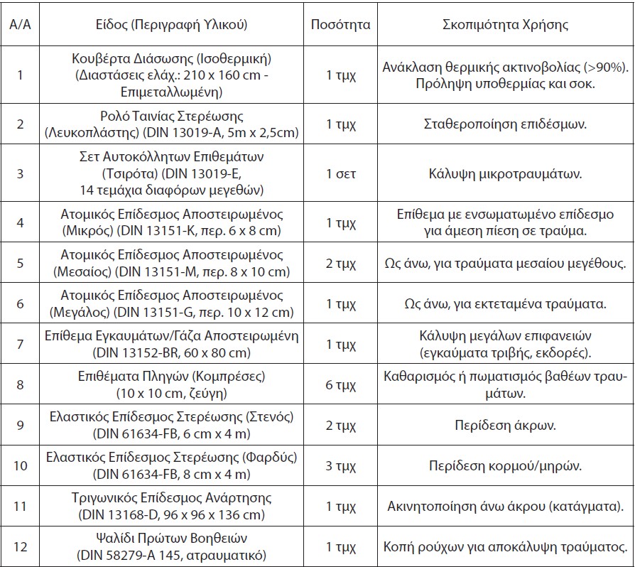 Σύμφωνα με την απόφαση, το φαρμακείο θα πρέπει να περιλαμβάνει κατ’ ελάχιστον 16 αντικείμενα. Ανάμεσά τους περιλαμβάνονται κουβέρτα διάσωσης ισοθερμική με συγκεκριμένες διαστάσεις, λευκοπλάστης, τραυμαπλάστ, επιδέσμους, επίθεμα εγκαυμάτων και πληγών, ψαλίδι πρώτων βοηθειών, γάντια μιας χρήσης, υγρά μαντιλάκια καθαρισμού δέρματος, ιατρική μάσκα προσώπου και οδηγίες πρώτων βοηθειών.