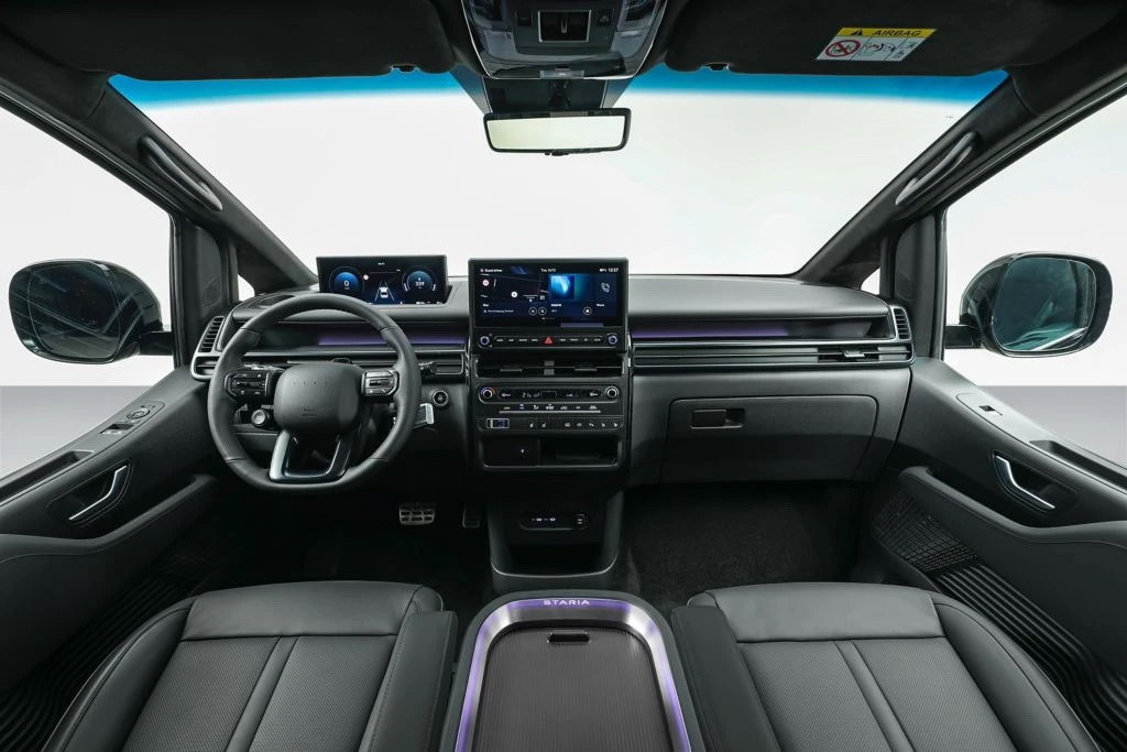 Βασισμένο σε υπάρχον μοντέλο (το Staria διατίθεται ήδη στη χώρα μας ως ήπια υβριδικό), το Staria EV δεν ανήκει επίσημα στην οικογένεια Ioniq. Ωστόσο, υιοθετεί αρκετά από τα σχεδιαστικά της στοιχεία, όπως οι φωτιστικές μονάδες τύπου pixel, και κυρίως την ηλεκτρική τεχνολογία. Η Hyundai δεν ξεκίνησε από λευκό χαρτί, με το μεγάλο πολυμορφικό να χρησιμοποιεί την αρχιτεκτονική 800 volt της πλατφόρμας E-GMP. Παρότι η μπαταρία χημείας NMC έχει χωρητικότητα 84 kWh (έναντι 110 kWh του Ioniq 9), το μοντέλο διατηρεί δυνατότητα ταχείας φόρτισης: Από 10% έως 80% σε μόλις 20 λεπτά. Η αυτονομία περιορίζεται στα 400 χιλιόμετρα, με τον ηλεκτροκινητήρας των 218 ίππων να κινεί τους εμπρός τροχούς. Σύμφωνα με τα δεδομένα της κατηγορίας, η ικανότητα ρυμούλκησης είναι γενναιόδωρη και φτάνει τους δύο τόνους. Ένας ακόμη τομέας στον οποίο το Staria EV επωφελείται από την «τράπεζα εξαρτημάτων» των ηλεκτρικών Hyundai είναι το εσωτερικό. Στο κόκπιτ δεν συναντά κανείς έναν λιτό, επαγγελματικό χαρακτήρα. Το τιμόνι, τα χειριστήρια του κλιματισμού, ο λεβιές μετάδοσης κάτω από το τιμόνι και οι οθόνες είναι αντίστοιχα με εκείνα των Ioniq. Η τιμή του Hyundai Staria EV δεν έχει ακόμη ανακοινωθεί.