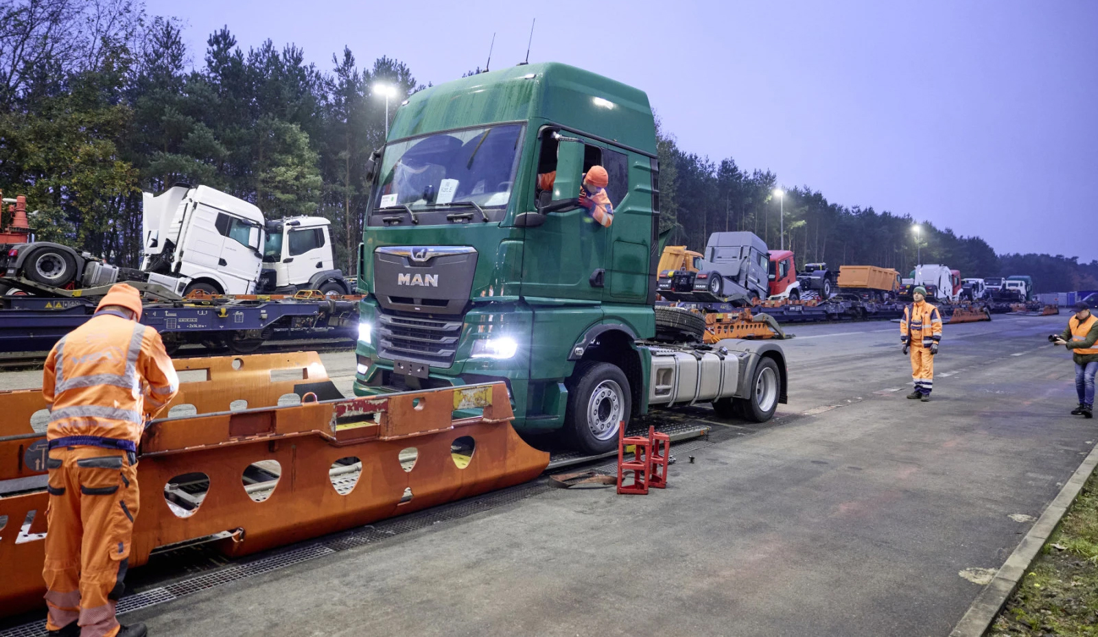 Σε συνεργασία με τον συνεργάτης της στα logistics, VEGA International, η MAN υλοποίησε ένα απλό και αποτελεσματικό σύστημα: Tα φορτηγά που βγαίνουν από το εργοστάσιο της Κρακοβίας, στην Πολωνία, μεταφέρονται με τρένο στη δυτική Γερμανία και η τελική παράδοση -σε ακτίνα 300 km γύρω από τον σιδηροδρομικό τερματικό σταθμό της Rheine, πόλης στο ομόσπονδο κρατίδιο της Βόρειας Ρηνανίας-Βεστφαλίας γίνεται αποκλειστικά με MAN eTGX, χωρίς τοπικές εκπομπές ρύπων. Έτσι, κάθε εβδομάδα παραδίδονται 30 έως 40 νέα φορτηγά με 100% ηλεκτρικό τρόπο.