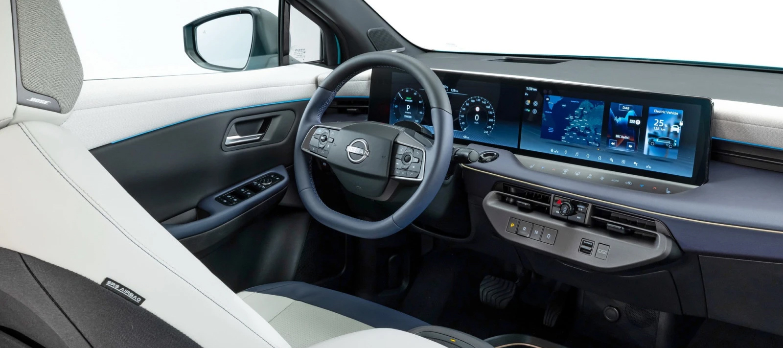 Ανάλογα σύγχρονη είναι και η εικόνα της καμπίνας. Η ψηφιακή σκηνή αποτελείται από δύο οθόνες 14,3 ιντσών, μία για τον πίνακα οργάνων και μία για το infotainment. Με τη δεύτερη να βασίζεται σε λογισμικό Google, προσαρμοσμένο με γραφικά και περιβάλλον χρήστη της Nissan. Μεταξύ άλλων, περιλαμβάνει φωνητικές εντολές, route planner και ψυχαγωγικές εφαρμογές.