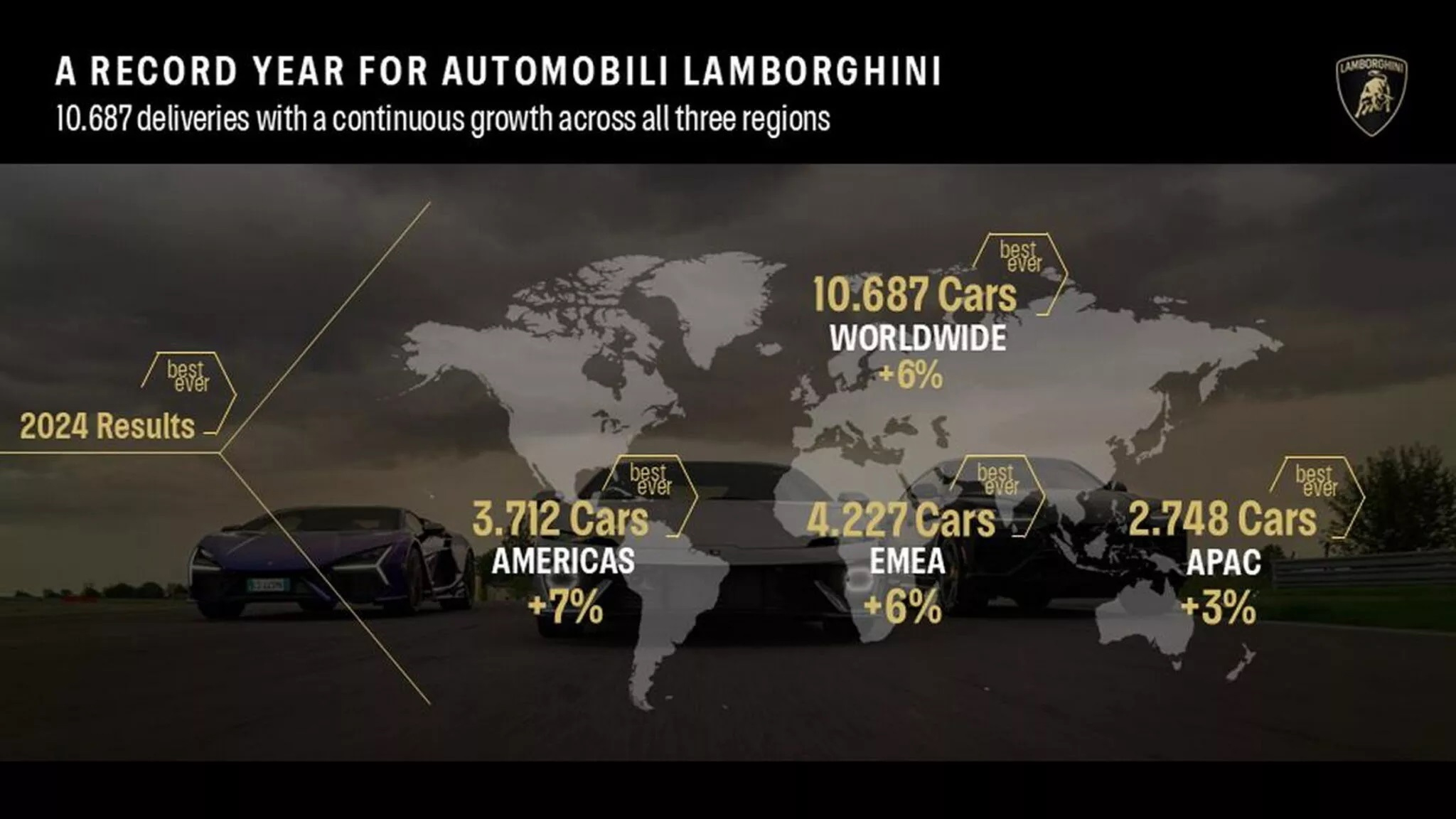 Ο Stephan Winkelmann, πρόεδρος και διευθύνων σύμβουλος της Automobili Lamborghini, δήλωσε: «Το 2024 ήταν μια χρονιά συνεχούς ανάπτυξης για την Automobili Lamborghini, σύμφωνα με τη θετική τάση των τελευταίων ετών». Το παγκόσμιο δίκτυό της περιλαμβάνει 186 αντιπροσωπείες σε 56 διεθνείς αγορές.