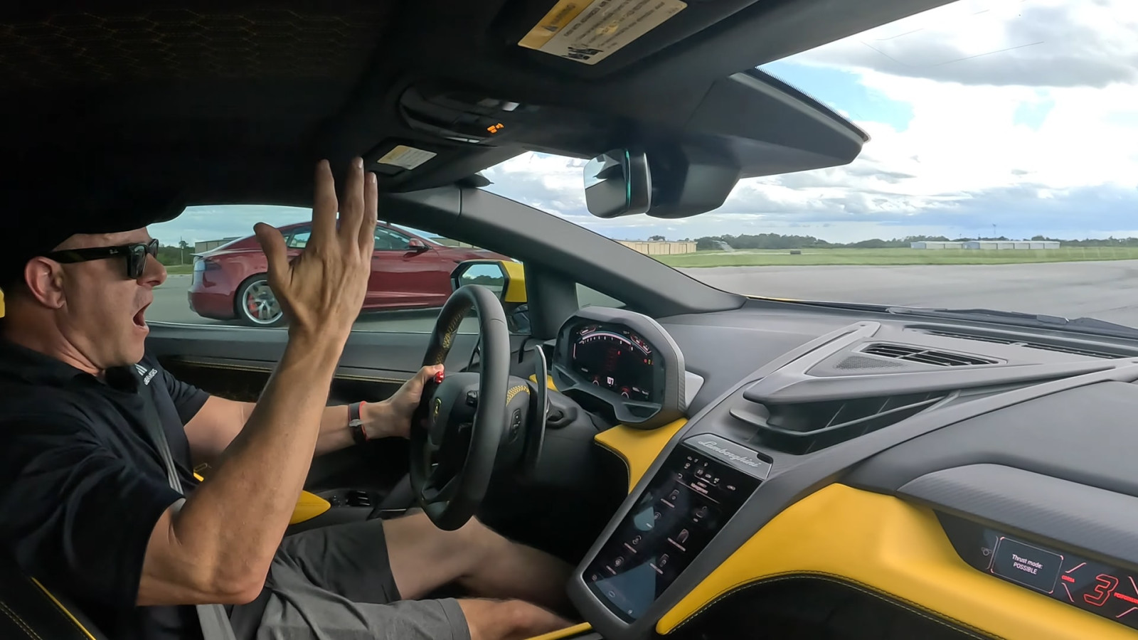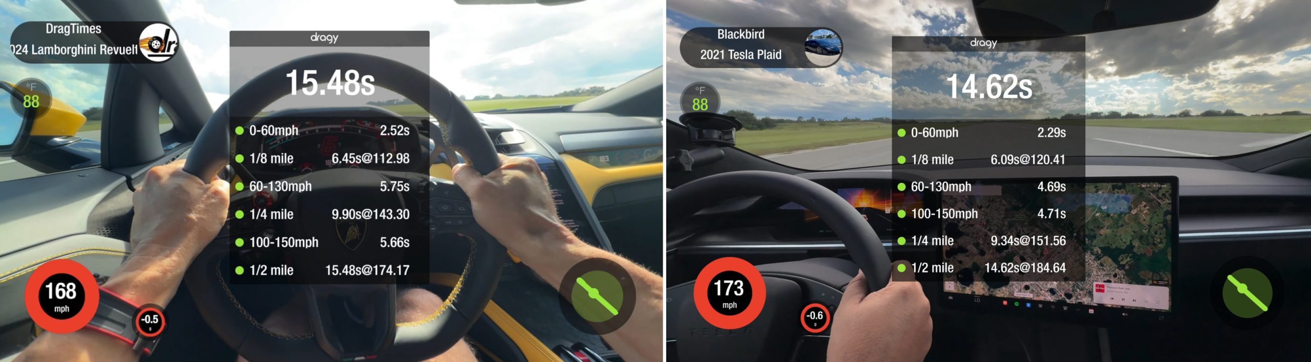 Επανέλαβαν τη διαδικασία και παρότι η Lambo ξεκίνησε πρώτη, είχε μικρότερη ταχύτητα εξόδου κατά 18 km/h. Περιττό να πούμε τι έγινε στην τρίτη αναμέτρηση. Σε καμία περίπτωση δεν είναι αργή. Φτάνει τα 60 mph (97 km/h) σε μόλις 2,52”. Διέσχισε τη γραμμή του 1/4 μιλίου σε 9,90” με ταχύτητα εξόδου 231 km/h και τερμάτισε τον αγώνα στο 1/2 του μιλίου σε 15,48” στα 280 km/h. Το Tesla Model S Plaid εκτοξεύτηκε στα 60 mph σε 2,29”, ολοκλήρωσε το 1/4 του μιλίου σε 9,34” με 244 km/h και το 1/2 του μιλίου σε 14,62” με 297 km/h.