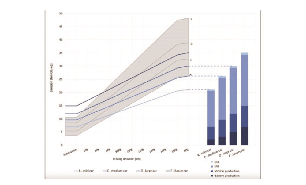 Από το παραπάνω διάγραμμα είναι κατανοητό ότι όσο μικρότερο είναι το ηλεκτρικό όχημα, έχει κατ΄ επέκταση μικρότερη μπαταρία και παράγονται λιγότεροι ρύποι για την παραγωγή τόσο της μπαταρίας όσο και του οχήματος γενικότερα. Επίσης παρατηρούμε ότι το στάδιο παραγωγής των ηλεκτρικών οχημάτων είναι πιο επιβλαβές από αυτά των αντίστοιχων συμβατικών. Το μεγαλύτερο μέρος των ρύπων τόσο στα ηλεκτρικά όσο και στα συμβατικά προέρχεται από τη χρήση των οχημάτων. Αυτό μπορεί να γίνεται είτε άμεσα, με την καύση του καυσίμου στην περίπτωση των συμβατικών, είτε έμμεσα μέσω της παραγωγής ηλεκτρικής ενέργειας στην περίπτωση των ηλεκτρικών.