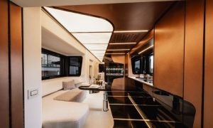 Δερμάτινες και ξύλινες επιφάνειες, ιταλικά έπιπλα και πανοραμική οροφή με ρυθμιζόμενο φωτισμό συνθέτουν μια premium εμπειρία ταξιδιού.